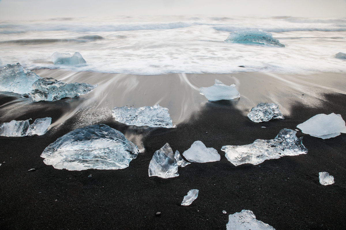 Kontrast między lśniącymi kawałkami lodu a czarnym piaskiem tworzy niesamowity, niemal surrealistyczny krajobraz. Lód przybiera różne kształty i rozmiary – od małych, przezroczystych kawałków przypominających kryształy, po ogromne bryły o błękitnym zabarwieniu. W zależności od światła, lodowe „diamenty” mienią się różnymi odcieniami, co czyni to miejsce wyjątkowo popularnym wśród fotografów.